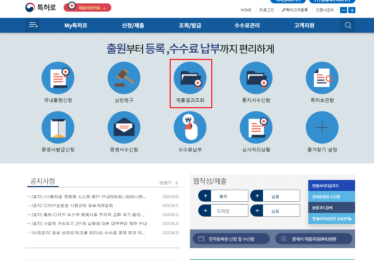 특허로 홈페이지에 접속하셔서 제출결과조회를 클릭하면