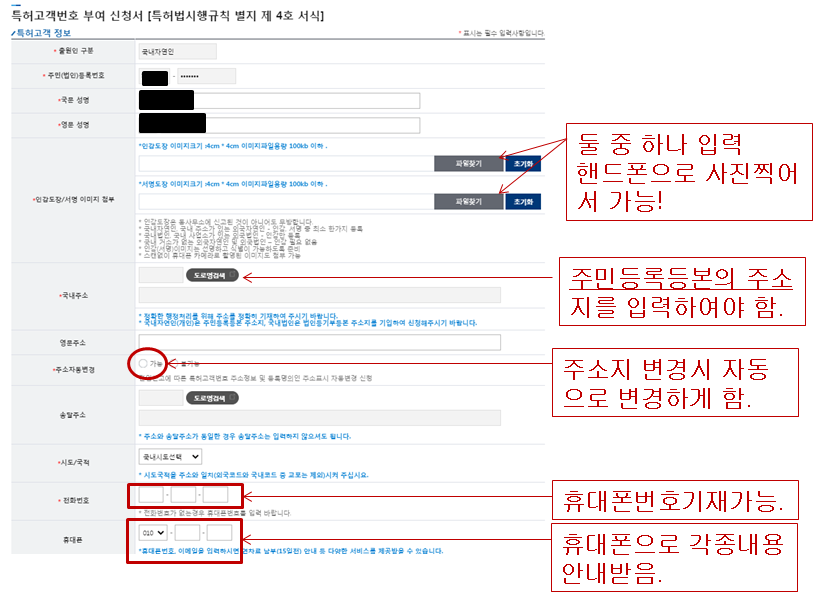 국내주소 항목에서는 반드시 주민등록등본에 기재된 주소지를 입력하여야 하며 그렇지 않을 때는 반려되어 처음부터 다시 신청서를 작성하여야 합니다.