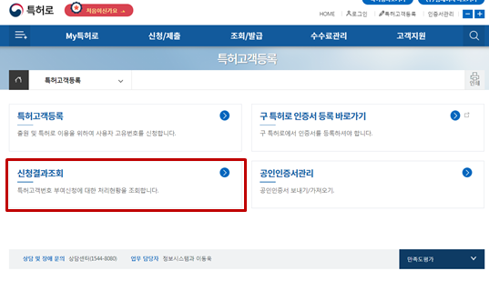 특허고객등록 페이지 <출처 : 특허로> 신청결과조회를 클릭합니다.
