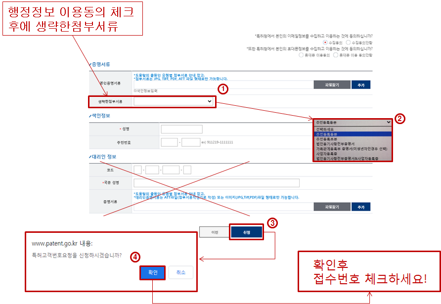 특허고객번호 부여 신청서 <출처 : 특허로> 행정정보 이용동의를 하셨다면 본인증명서류를 생략이 가능하게 됩니다. 이때 생략한첨부서류는 주민등록등본입니다.