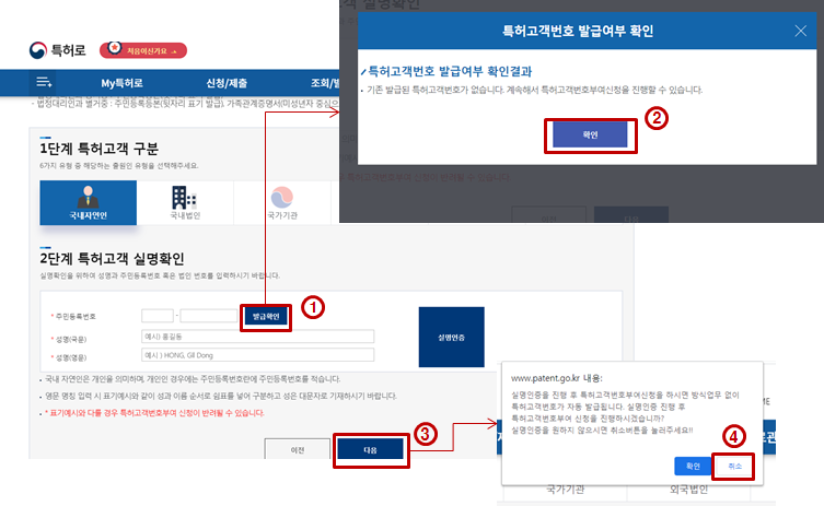 특허고객등록페이지 <출처 : 특허로> 주민등록번호를 기재하여 발급확인 한후에 성명을 국문과 영문 모두 기재하시고 다음을 누르면 됩니다. 이때 실명인증에 대하여 나오지만 실명인증을 하지 않아도 진행이 가능합니다.