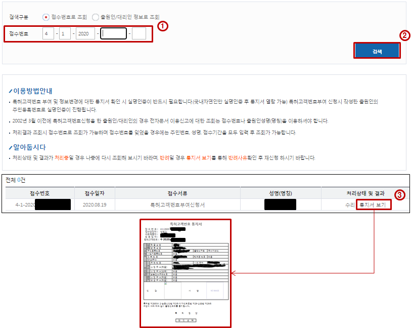 신청결과조회 페이지 <출처 : 특허로> 접수번호를 기재하고 검색하면 위와같이 볼수 있습니다. 여기서 수리가 되었다면 통지서 보기 클릭한 후에 특허고객번호 통지서를 받아 볼 수 있습니다.