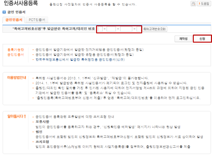 인증서사용등록 페이지에 가셔서 특허고객번호를 입력합니다.