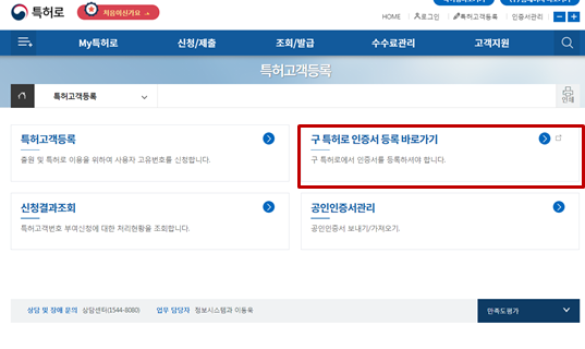 특허고객등록 페이지 <출처 : 특허로> 공인인증서 등록