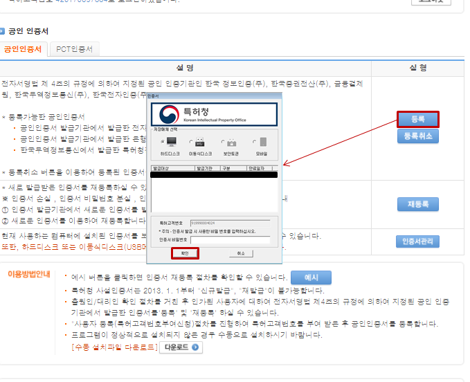 특허고객번호를 문제 없이 다 받으셨다면 인증서 사용등록을 하여야합니다.